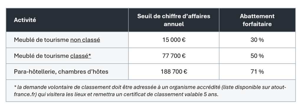 Pour les propriétaires de logements locatifs meublés touristiques, les règles du régime micro-BIC, pour les loyers encaissés (ou courus, en cas de comptabilité d’engagement) depuis le1er janvier 2025 sont :